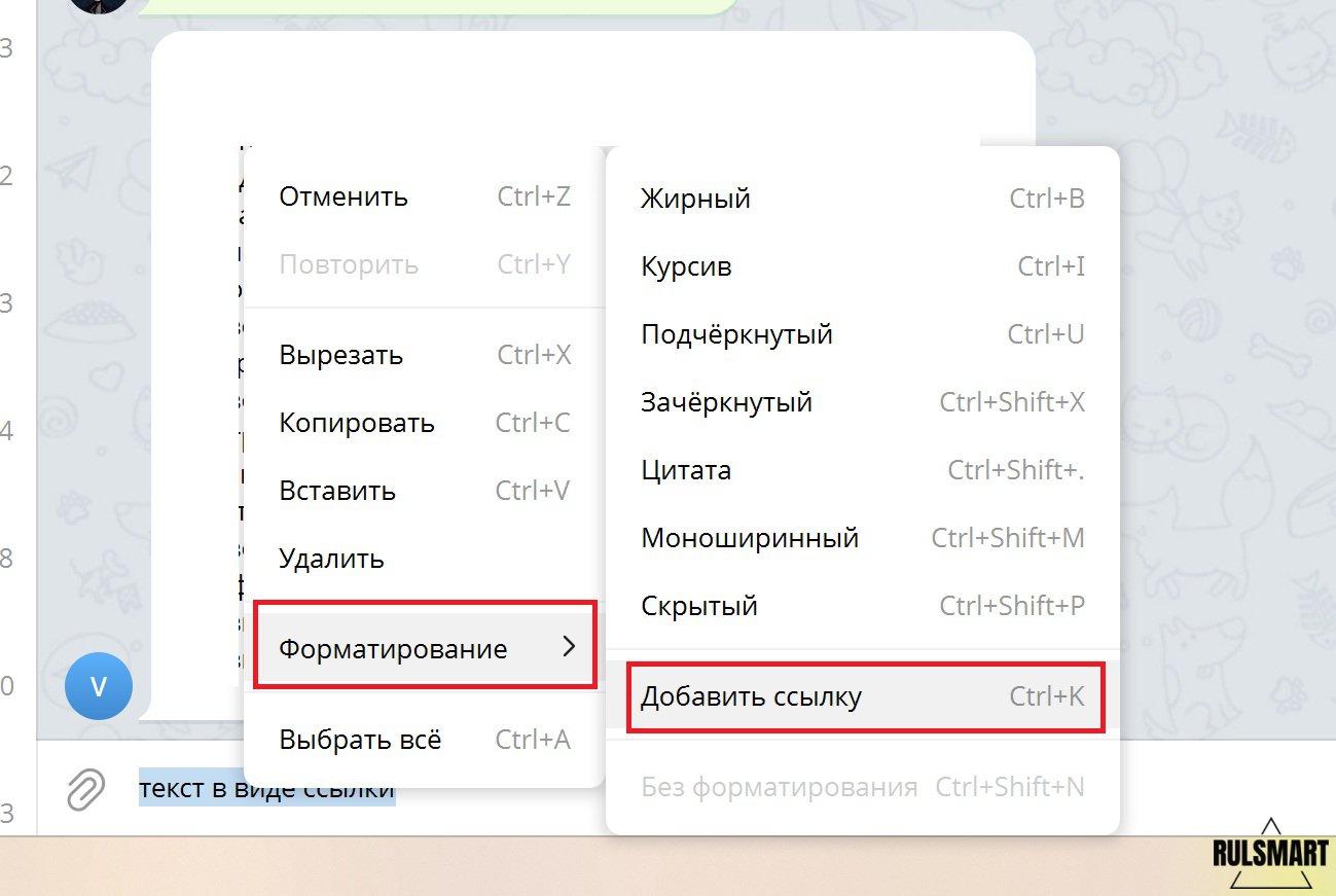 ![]() Несмотря на то, что в ряде стран Telegram подвергается ограничениям и блокировке, данная социальная сеть и мессенджер остается лидером в своем сегменте, предоставляя пользователям возможности взаимодействия и общения. С каждым обновлением в Telegram появляется новый функционал, совсем недавно стал доступен крафт подарков, а публиковать сторис теперь могут не только владельцы подписки Premium, но и пользователи с бесплатными аккаунтами. Одна из фишек Telegram — форматирование текста. Вы можете отправить текстовое сообщение, изменив формат текста, сделав его жирным, курсивным, подчеркнутым или скрытым. Далеко не все пользователи знают, что текст можно превратить в ссылку в Telegram. Если нажать на такой текст, то пользователю предложит перейти по ссылке, как же это реализовать? В диалоге с человеком вам нужно набрать слово или текст, который вы хотите превратить в ссылку. Далее на компьютере выделяем текст и нажимаем правую кнопку, в разделе "Форматирование" выбираем пункт "Добавить ссылку" или же нажимаем на клавиатуре сочетание клавиш Ctrl+K, после чего вставляем ссылку. Если же вы используете смартфон или планшет, сделать все то же самое можно, если сделать долгий тап по выделенному тексту. | |